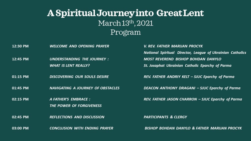 A Spiritual Journey into Great Lent Posted bySophia ShchurFebruary 23, 2021February 3, 2022Posted inUncategorized REGISTER HERE Share this: Click to share on X (Opens in new window) X Click to share on Facebook (Opens in new window) Facebook Like Loading... Related