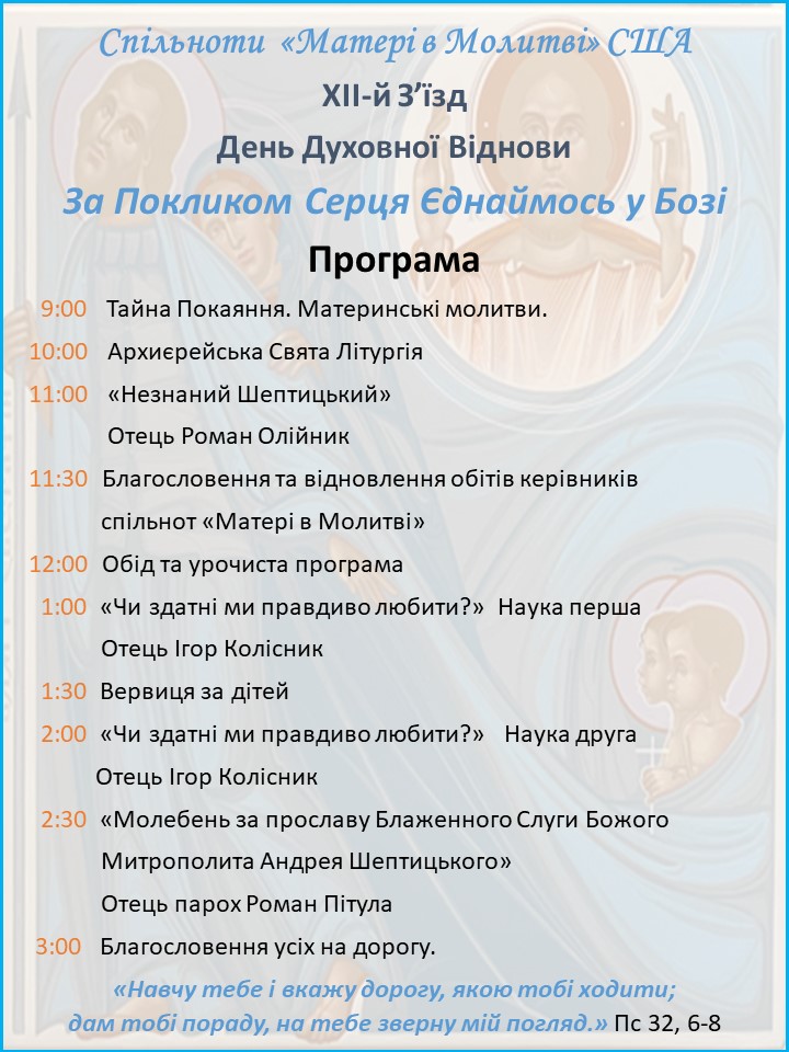 Mother’s in Prayer invite you to join them for their 12th annual day of spiritual renewal at the Ukrainian Catholic Cathedral of the Immaculate Conception, on Saturday October 30th beginning at 9:00 am. Contact: ukrmipusa@gmail.com