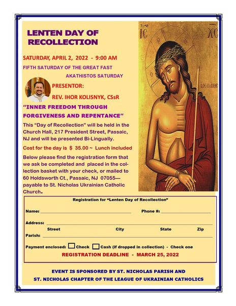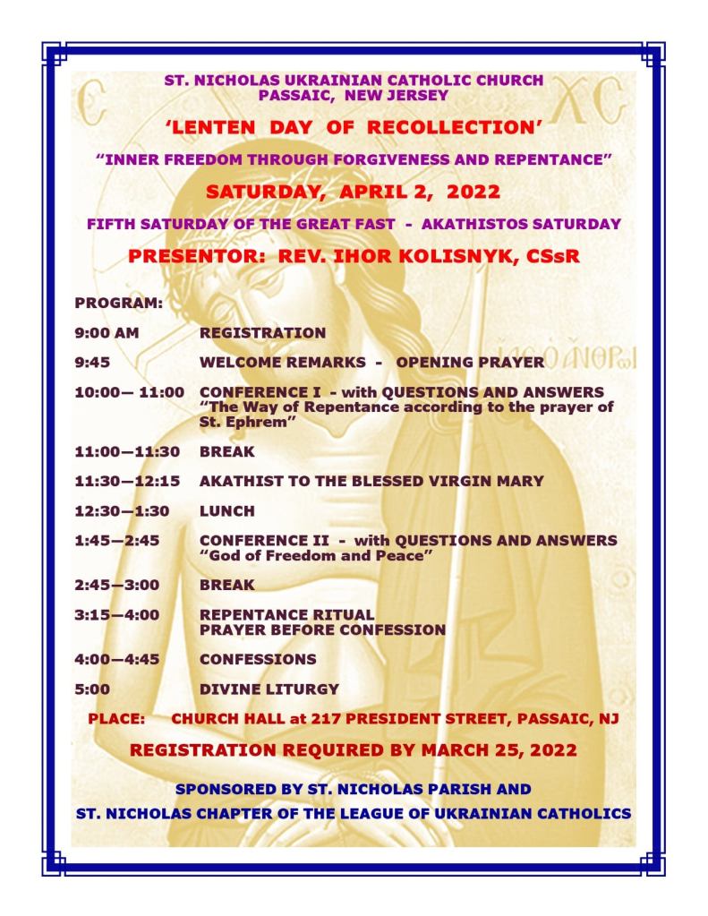 St. Nicholas Chapter of the League of Ukrainian Catholics invite you to Lenten Day of Recollection
