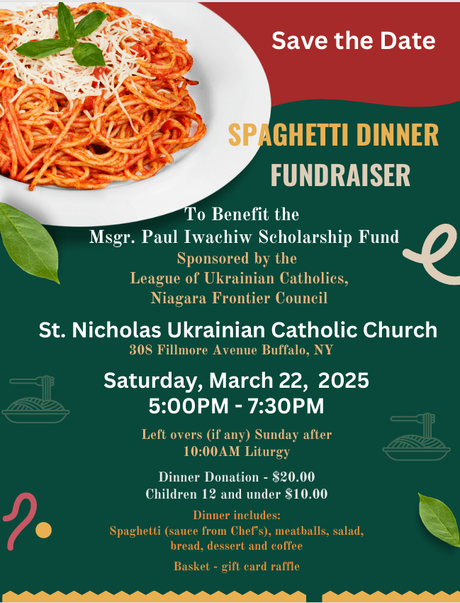 On Saturday, March 22, 2025, the League of Ukrainian Catholics, Niagara Frontier Council is sponsoring a Spaghetti Dinner Fundraiser to benefit the Msgr. Paul Iwachiw Scholarship Fund. Our scholarship fund lacks the money to award another scholarship, so we are having this fundraiser in the hopes of raising even money to replenish the fund to continue offering a scholarship to a deserving student.